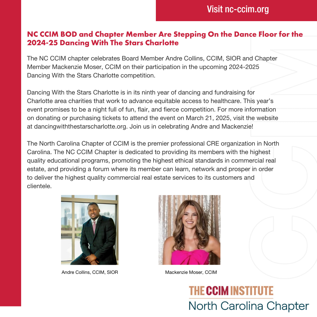 The NC-CCIM chapter celebrates Board Member Andre Collins, CCIM, SIOR and Chapter Member Mackenzie Moser, CCIM on their participation in the upcoming 2024-2025 Dancing With The Stars Charlotte competition.